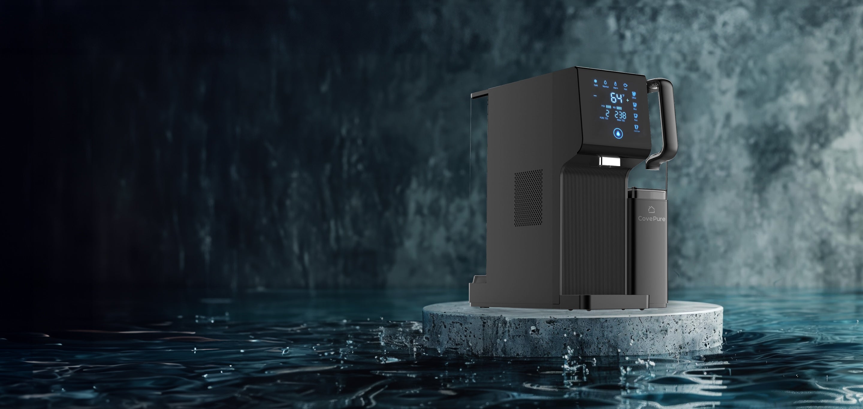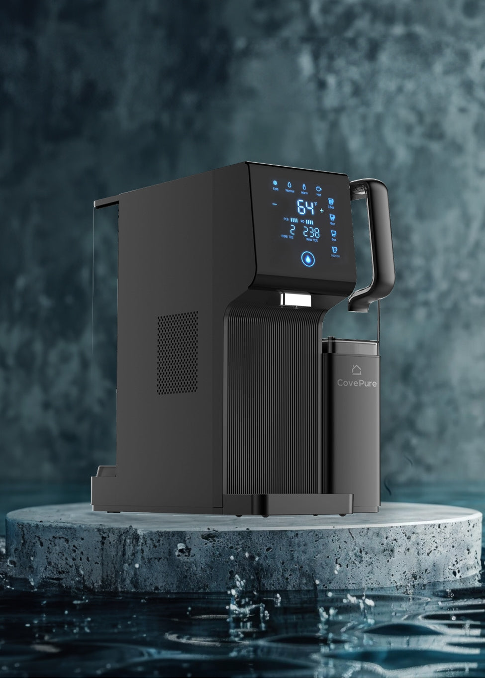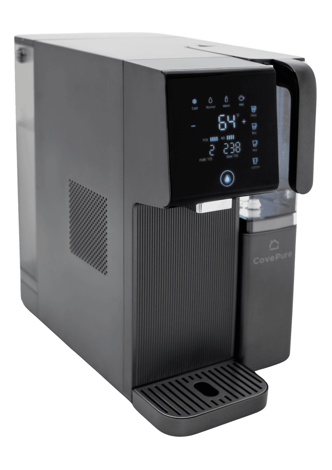 CovePure sits on your countertop and works seamlessly. Just fill the tank with water, and the machine takes care of the rest.